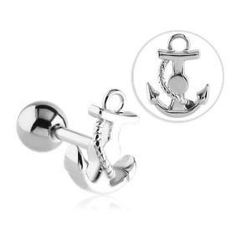 The 14 gauge 5/8″ anchor tongue barbell is made from 316L stainless steel with external threading.