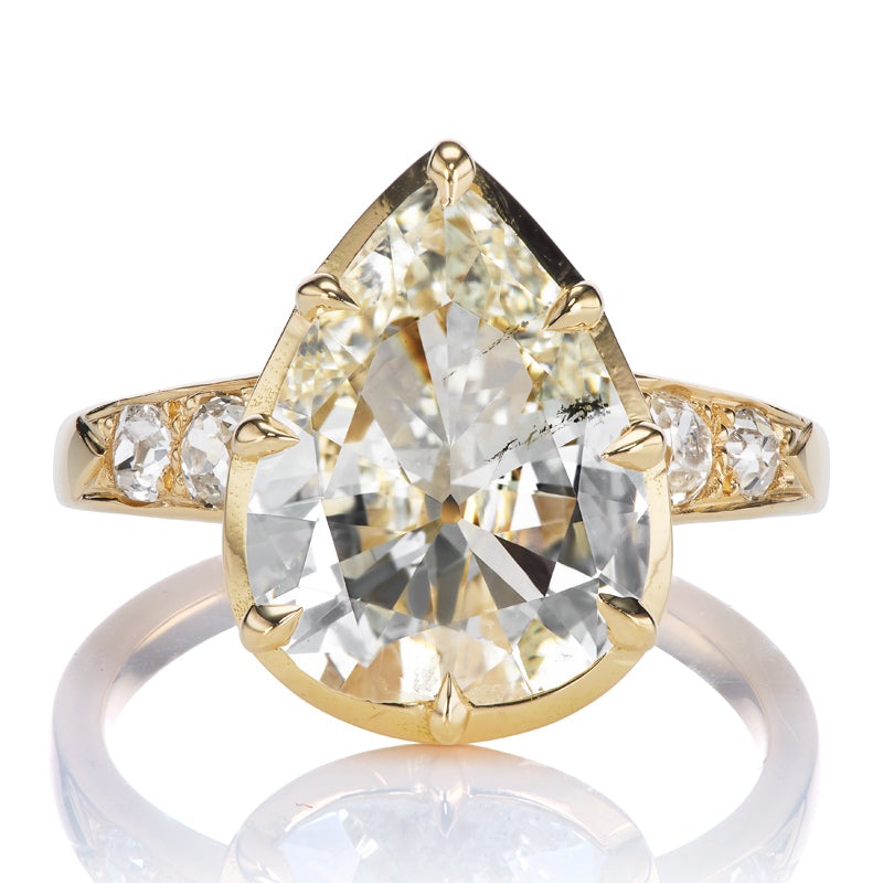 The Andria 2.70 ring is an AB original design made right here in NYC. The ring centers a GIA-certified 2.70-carat Pear Cut diamond of L color, I1 clarity. The stone is collet-set in our signature 18kt yellow gold with two Old Mine Cut diamonds bead-set into each shoulder. The ring is currently size 6 and can be resized!