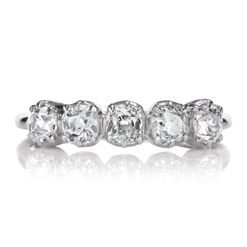 Five Stone Old Cut Diamonds in Platinum Collet SettingThe Andria Band 1.10 is an AB original design made right here in NYC. The ring centers 5 Old Mine Cut diamonds totaling 1.10 carats of approximately I-J color, SI-I clarity. The stones are set in a plat