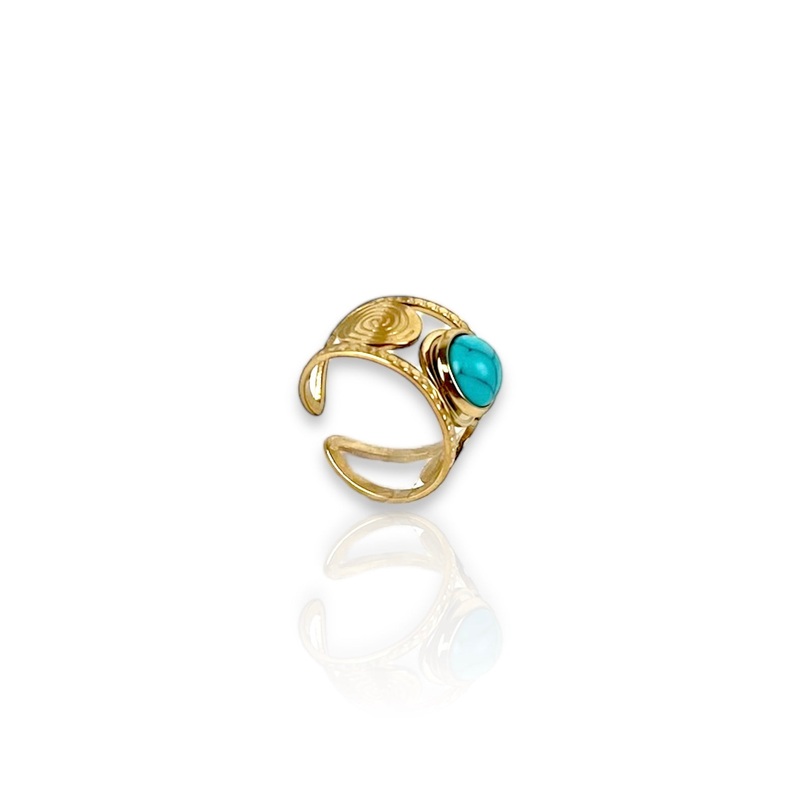 Anillo dorado piedra azul en el centro. Es ajustable, sirve para todas las medidas.Esta hecho de acero quirrgico. Este material no pierde el color y no es alrgico.Material: acero alergnicoEste articulo esta diseado y fabricado integramente en Europa e impo