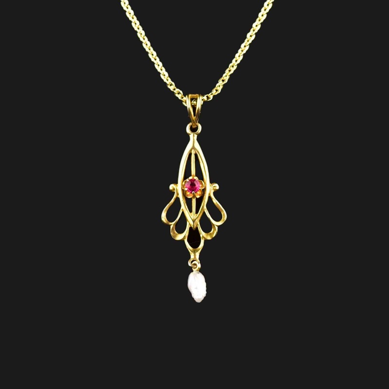 Elegant and stylish, this vintage necklace from the 1910s showcases a 10K yellow gold lavaliere design with a sparkling ruby gemstone and a natural pearl accent. A classic and timeless piece of jewelry, perfect for those born in July.Video available here..