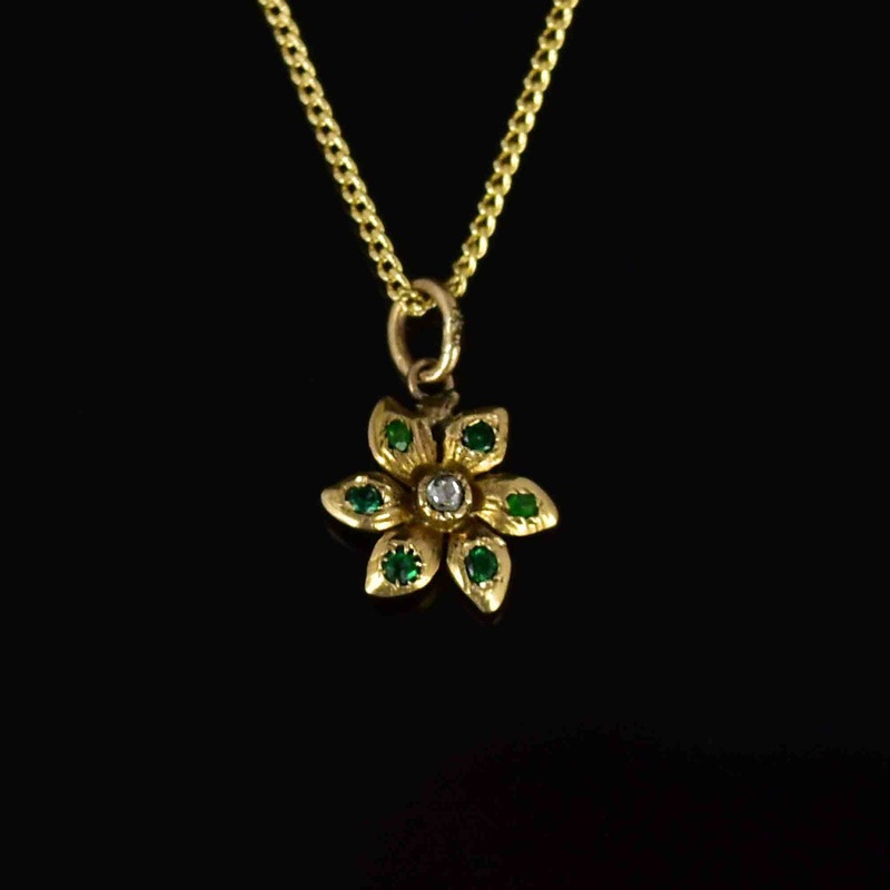 Antique 14K Gold Diamond Emerald Flower Charm Pendant Necklace