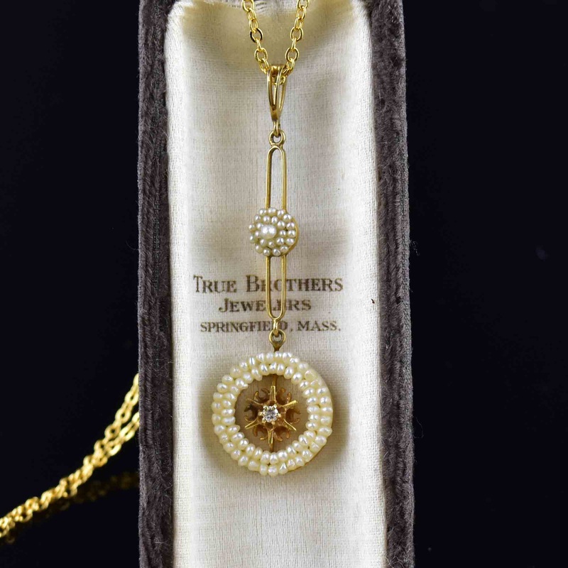 Antique 14K Gold Diamond Seed Pearl Lavaliere Necklace