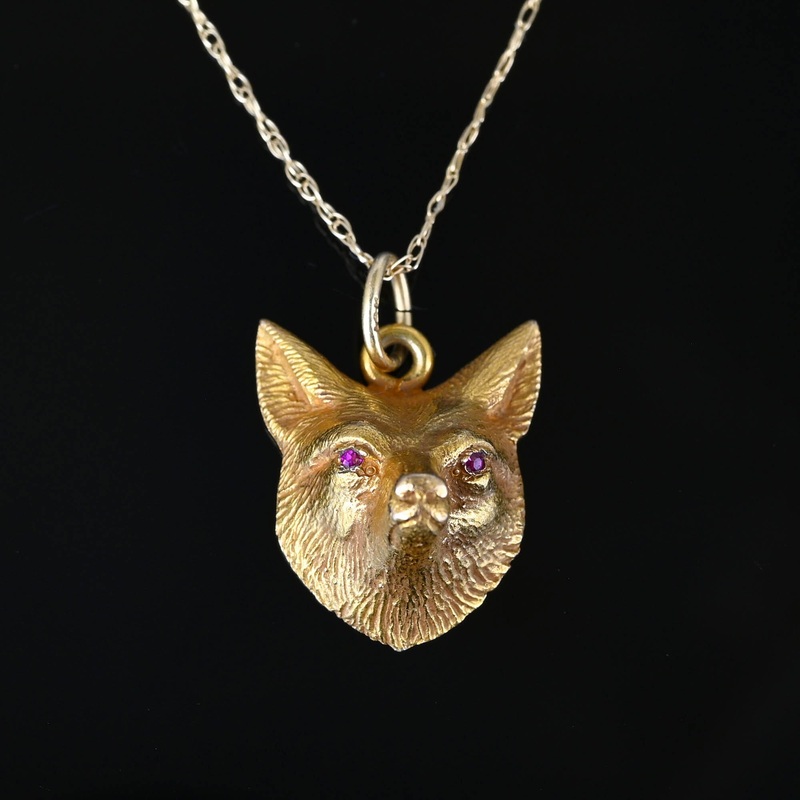 Antique 14K Gold Ruby Eye Fox Pendant Necklace