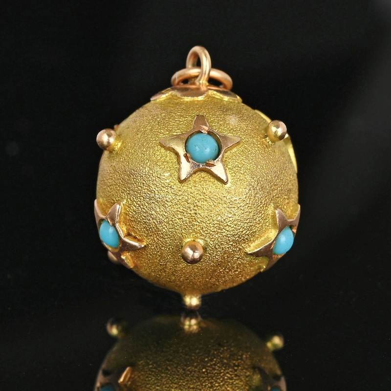 This antique 14K gold pendant boasts a sputnik-style design with rose gold stars and turquoise cabochons at its core. The solid gold textured round pendant is intricately adorned with 14K rose gold raised beads and stars, complemented by a floral-signed top and bale in rose gold. A burst of color is added by the natural turquoise cabochons, making this a truly distinctive and exceptional piece of antique jewelry.