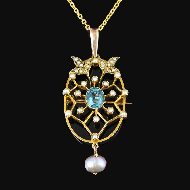 Antique Baroque Pearl Blue Tourmaline Pendant Brooch