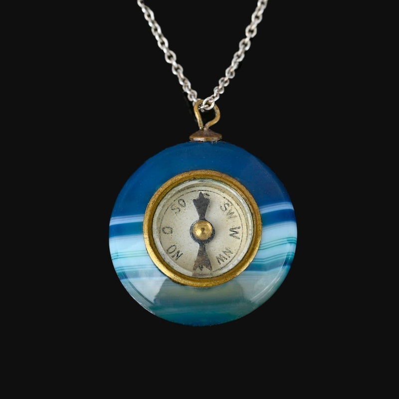 Antique Blue Banded Agate Working Compass Pendant Necklace