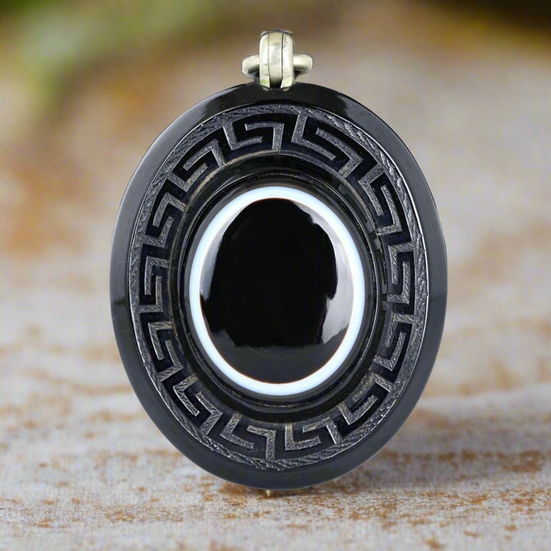 Impressively oversized and exquisitely carved Whitby Jet locket pendant from the Victorian era. Featuring a prominent bulls eye banded agate at its core, this ornately adorned piece boasts a detailed Greek key design on both front and back, with the latter