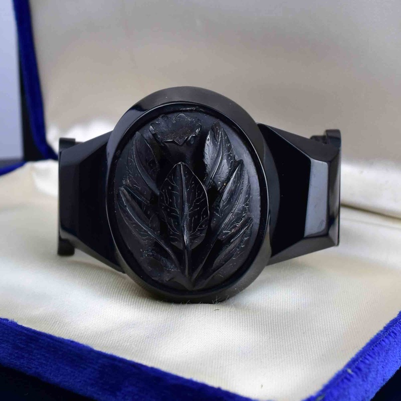 This stunningly large and wide Victorian Whitby jet bracelet features a beautifully carved lily flower design! The elongated oval links showcase the exquisite front piece, crafted from a single, oversized piece of Whitby jet. Originally used for mourning i