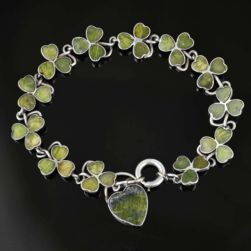 Antique Connemara Marble Shamrock Bracelet w Heart Padlock