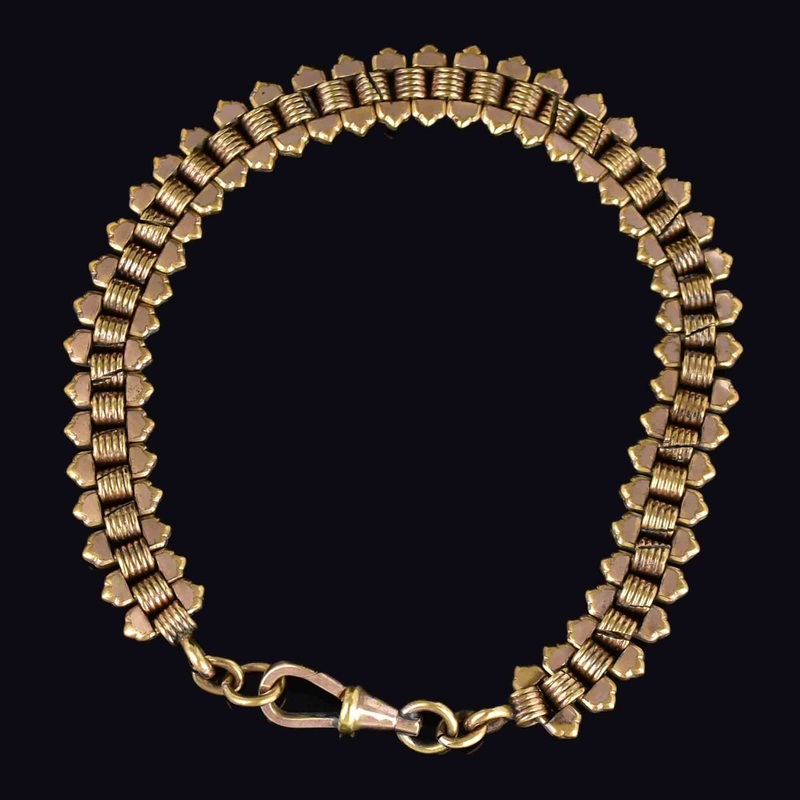This unique antique bracelet features a stunning double-sided pocket watch chain design in luxurious rolled gold. The flexible links are adorned with intricate rectangle details in the center and diamond shaped links on the sides. Complete with a dog clip