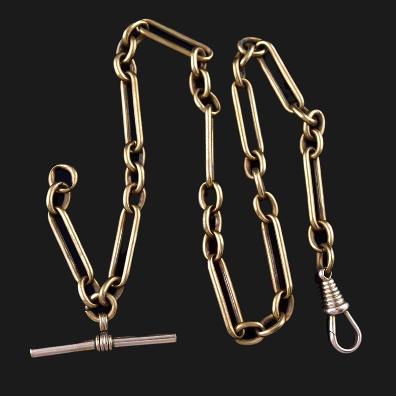 This elegant antique Edwardian Albert curb watch chain is crafted from luxurious rolled gold. The weighty curb chain features trombone links and is finished with a t-bar and dog clip. Use it as a stylish bracelet, a classic watch chain for men, or a chic n