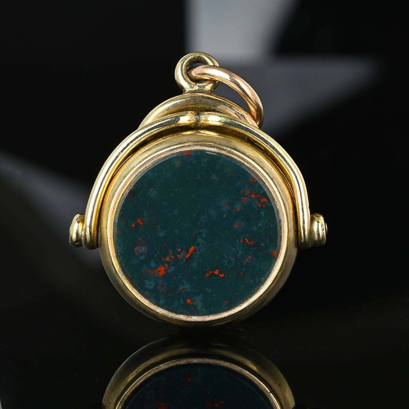 This solid 9K gold barometer compass spinning pocket watch fob is an exceptional and rare Victorian antique. With a weight of 13.2 grams, the compass features a hand-set blue enamel pointer that indicates direction, as well as a graduated scale thermometer surrounding the compass. The reverse side of the fob is adorned with a beautiful bloodstone, adding a unique touch to this collectible piece of antique jewelry. Perfect for gifting to a dear friend, for a graduation ceremony, or as a unique addition to a men’s watch chain or necklace.