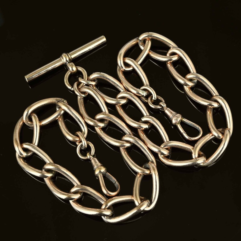 Elegant classic Antique Large Curb Link Double Albert Watch Chain Necklace in rose-colored rolled gold for a touch of vintage charm. Features a toggle and double dog clips, perfect for holding a pocket watch or wearing it as a necklace or bracelet. A versatilewatch chain for either men or women!