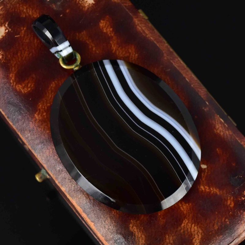 Behold, a stunning antique banded agate necklace! The intricately designed large agate forms an oval shape with an array of colors, from snowy white to rich chocolate, adorned with bands throughout. Adding to its charm is a hand-carved circular bale at the top. During the Victorian era, banded agate necklaces were all the rage in England, causing the mines that sourced these gems to be depleted by 1900. Exquisite Victorian necklace as in style today as it was well over 100 years ago.