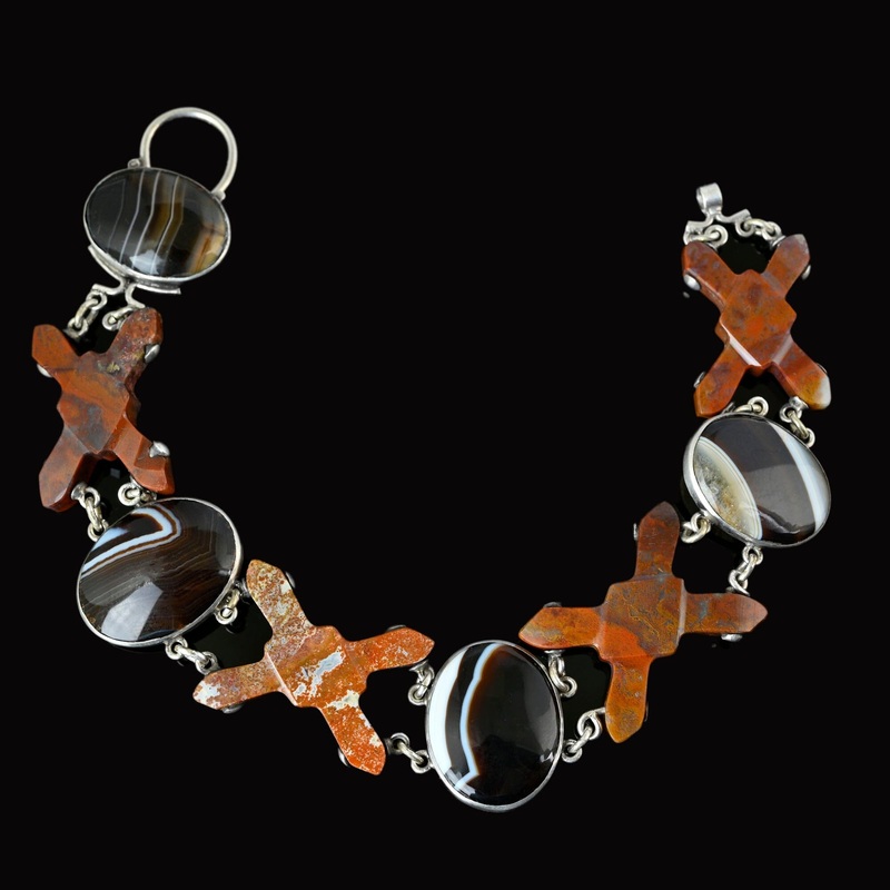 Exquisitely rare antique Scottish banded agate bracelet featuring an engraved silver banded agate padlock clasp. Crafted in sterling silver, the agates boast a stunning combination of banded black and white agates and intricately carved X brown agate links