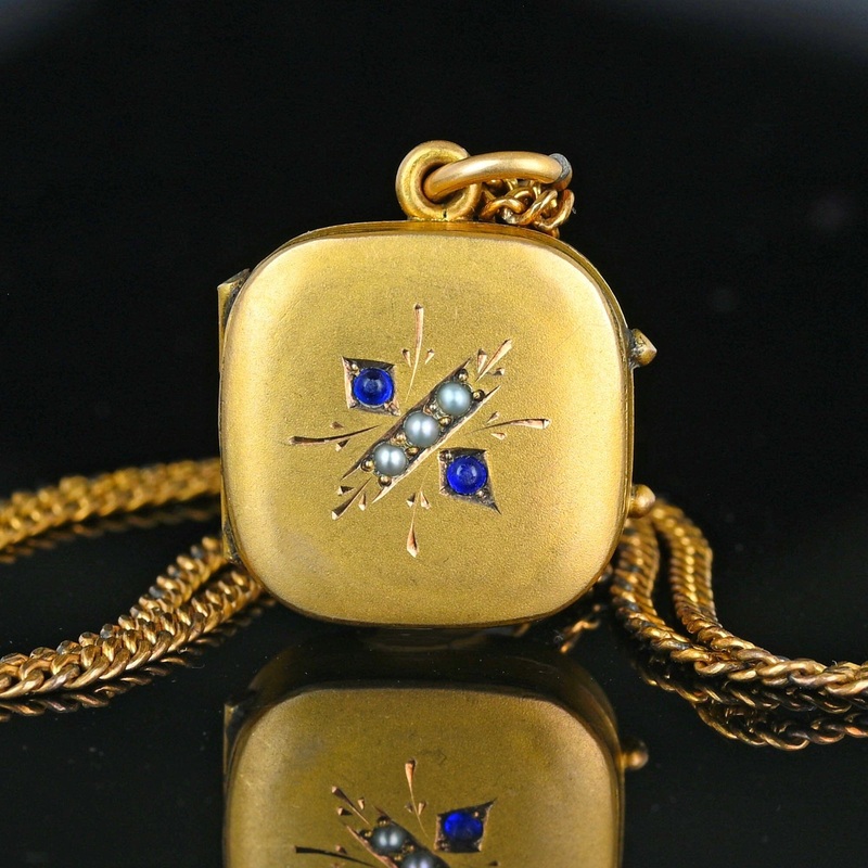 Antique Sapphire Paste Pearl Gold Filled Square Locket