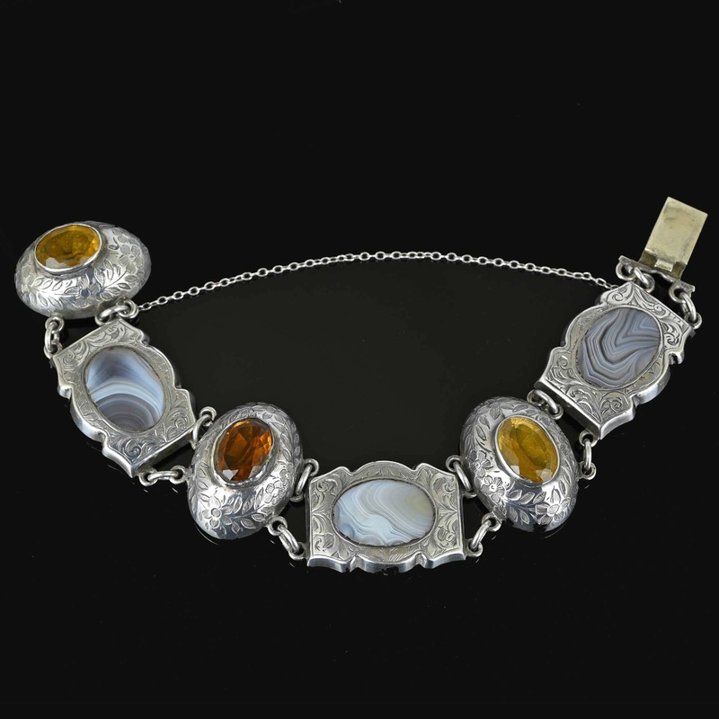 A remarkable antique bracelet crafted in sterling silver with alternatinglinks of precious citrines from theCairngormmountain range and exquisite Montrose agate. Carefully fashioned with an ornately carved floral design, the foiled citrines are raised in graceful curves, interspersed with striking plaques of contrasting grey and cream Montrose agate. Fastened with a slide clasp and secure safety chain, this exquisite Scottish jewelry is a captivating addition to any collection.