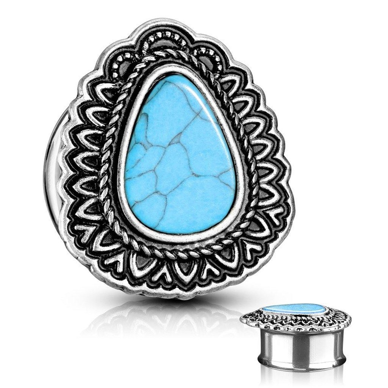 Antique Turquoise Teardrop Top Plugs 2 gauge (6mm) Stainless Steel Pair