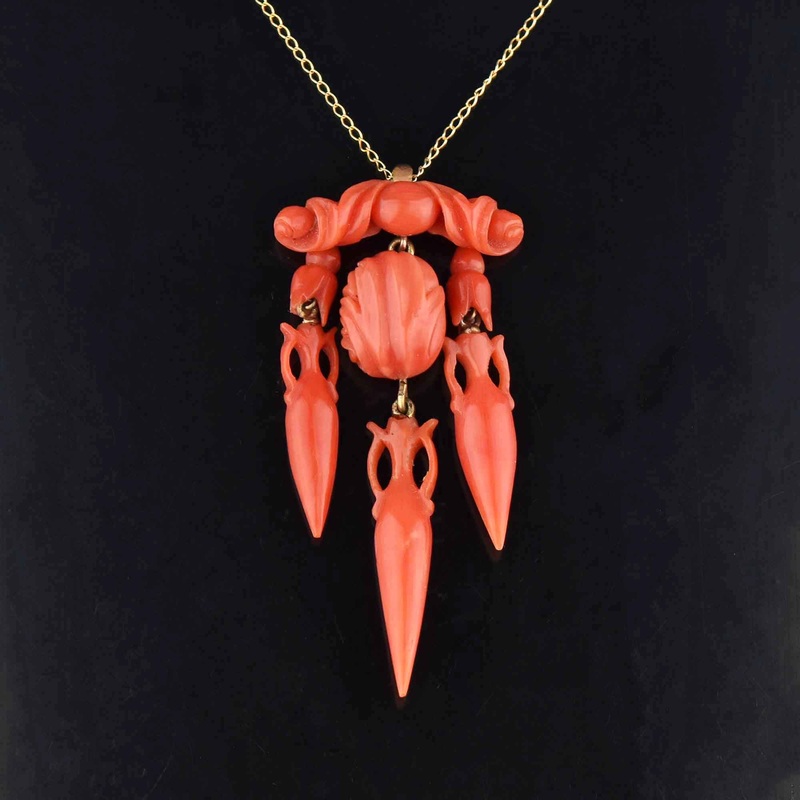 Antique Victorian 14K Gold Amphora Carved Coral Necklace