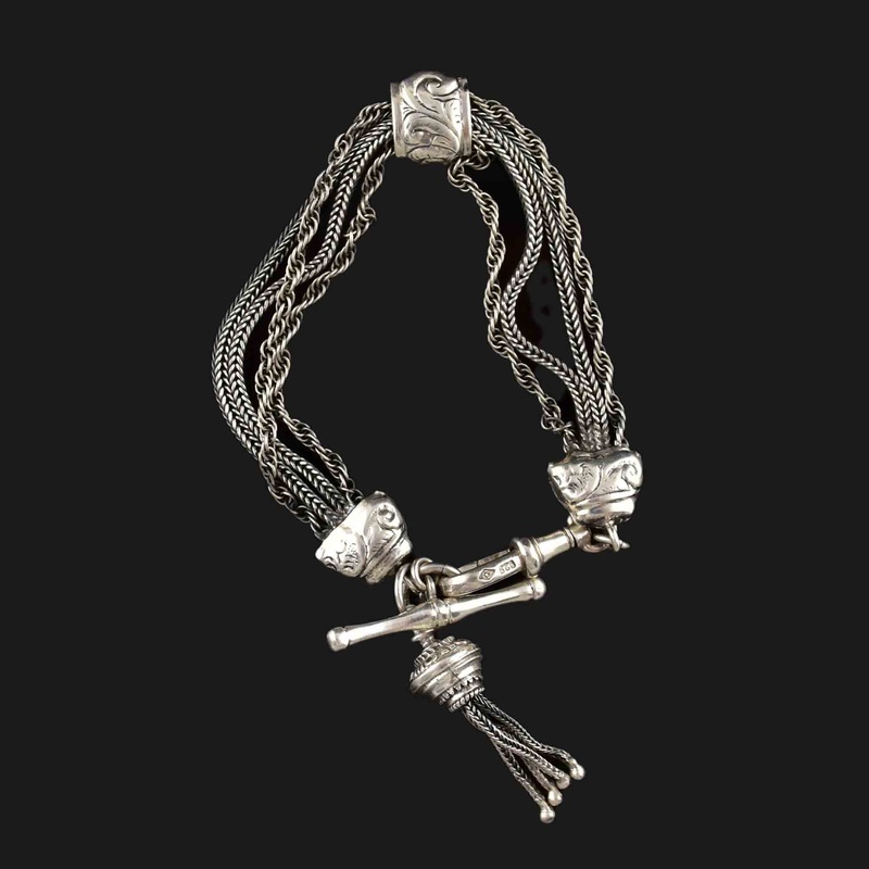 This stunning Victorian Albertina watch chain bracelet features a beautifully embossed center scroll slider and a tassel charm that dangles playfully. Four sterling silver rolo and snake chains are connected at each end by double-sided silver caps, each with an intricate scroll design. One end features a twisted t-bar, while the other has a dog clip swivel clasp. Wear it as a bracelet or use it for its original purpose – to display a pocket watch!