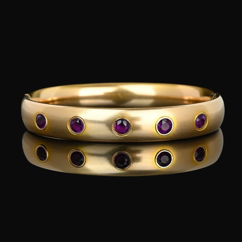 This Victorian bangle bracelet features antique gold filling with inset vibrant purple amethyst paste gemstones across the front. It is produced by F&B and has a smooth back with a secure pin slide clasp. This versatile piece is perfect for stacking or wearing alone.
