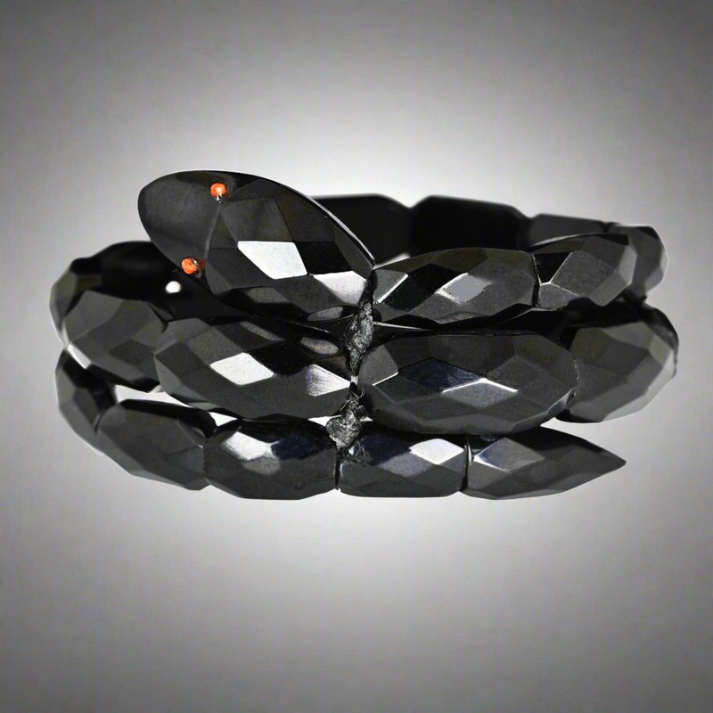 Antique Victorian Coral Eyed Whitby Jet Snake Bracelet
