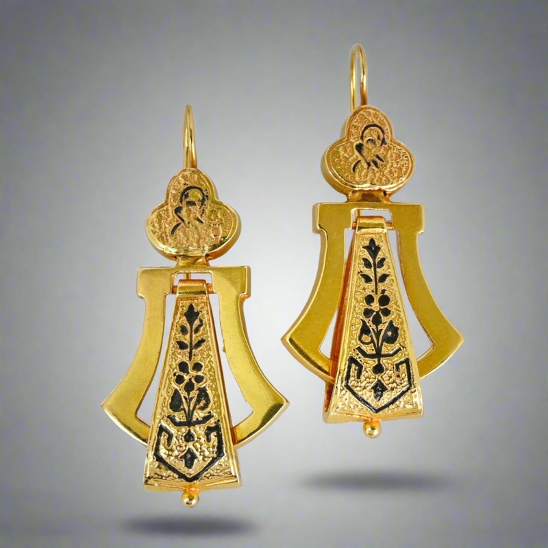 These 14K gold antique Victorian earrings are both elegant and striking, featuring intricate enamel details. The wire-pierced earrings have trefoil tops adorned with lily of the valley enamel, leading down to large pendant drops with a vine motif. The addition of black taille d’epargne enamel adds a unique depth to the design. With their three-dimensional appearance, these earrings are truly one-of-a-kind classic beauties!