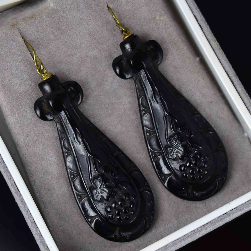 These exquisite Victorian earrings are crafted from hand carved Whitby jet and feature a detailed grapevine design on the front and a solid back. Originally meant for mourning over 150 years ago, they now make a stunning addition to any modern wardrobe. A