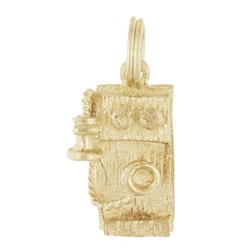 This 14K gold antique wall telephone charm reissue features engraved 3 dimensional details and measures 9/16 inch high by 3/8 inch wide. Perfect for a western or old time theme charm bracelet, this unique gold wall phone charm has a split ring bail for eas