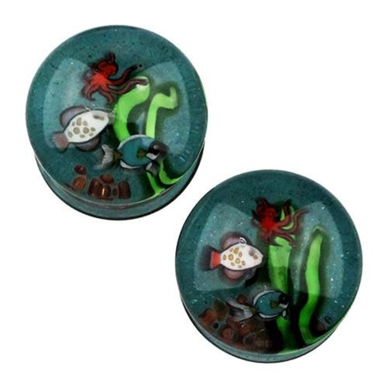 These double flare aquarium plugs are made from hand blown borosilicate glass by Glasswear Studios. They have a wearable area of approximately 3/8″ between flares. Choose your size below.