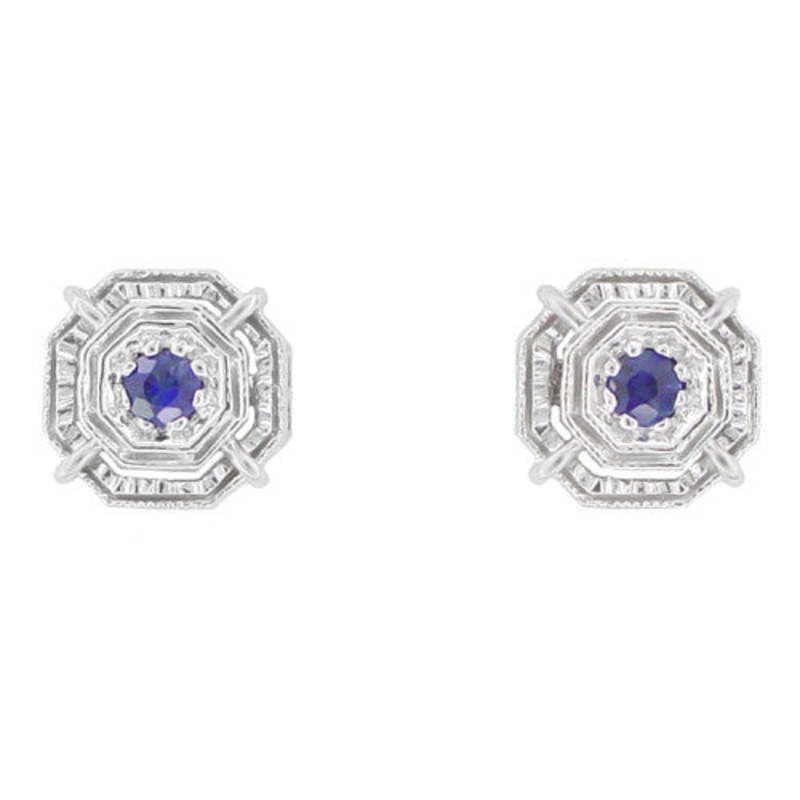 These beautiful vintage inspired sapphire stud earrings in 18K white gold feature a timeless Art Deco concentric geometric design, awash in light scattering millgrain beaded edging.