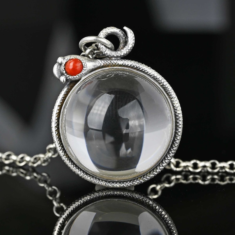 This exquisite 1930s Art Deco necklace boasts a striking dangling pendant of luminous rock crystal, gracefully asymmetrically circled by the beguiling silhouette of a snake, embellished by a radiant coral gemstone. Crafted with sterling silver, the crystal orb’s serpentine form ensconces the pools of light crystal, its curling coral cabochon head curling around the top of the crystal, and its tail forming an elegant closure. A captivating good-luck charm!