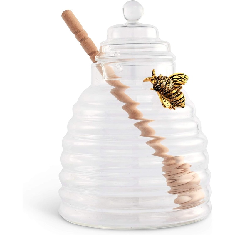 NewBeehive Honey Dispenser for Store Honey and Syrup - Wooden Honey Dipper, Great as Honey Spoon and Syrup Dispenser - Gold Pewter5.5 inch Tall 12 Oz