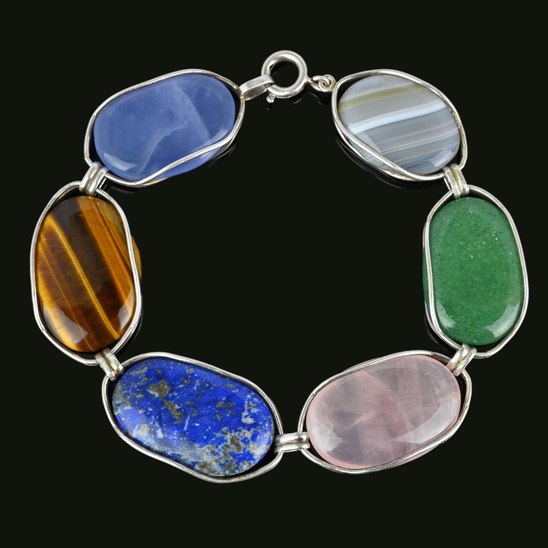 A gorgeous Arts and Crafts style gemstone bracelet that's full of personality! With six lovely natural gemstones including blue chalcedony, tiger eye, lapis lazuli, pink quartz, banded agate, and green chrysoprase, this bracelet is guaranteed to turn heads
