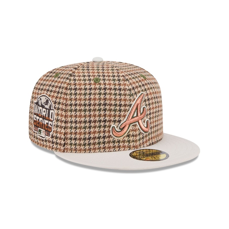 The Atlanta Braves Houndstooth 59FIFTY Fitted Cap features an embroidered Braves logo at the front panels with a matching MLB Batterman logo at the rear and a houndstooth fabrication. Additional details include a 2021 World Series patch at the right-wear side, a stone visor, and a gray undervisor.