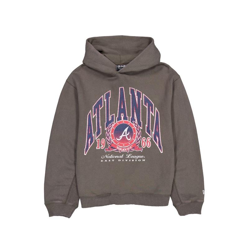 The Atlanta Braves Oversized Essentials Hoodie features a distressed screen-printed Braves graphic at the front.