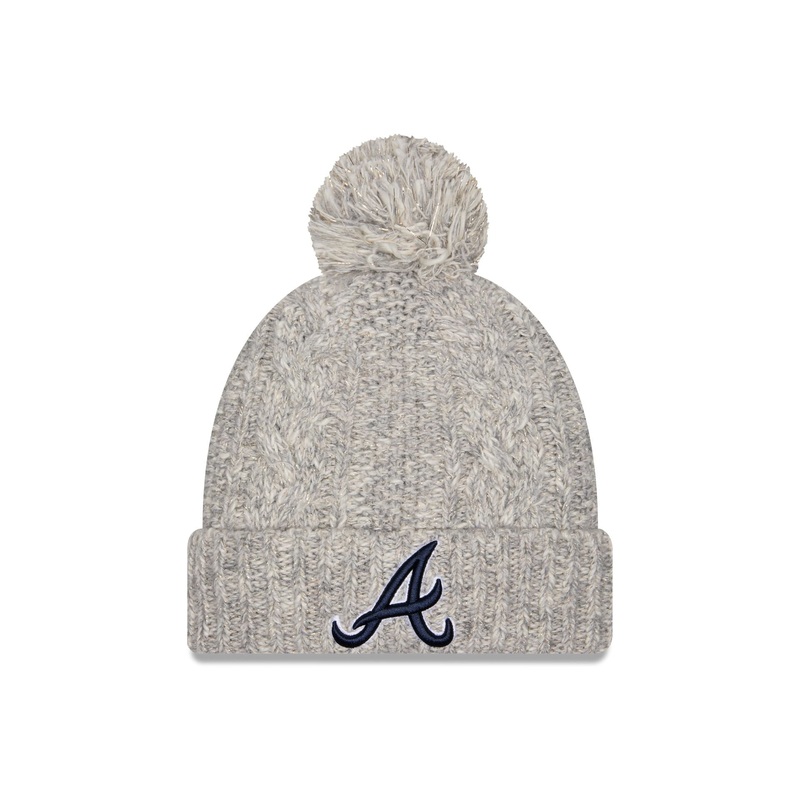 The Atlanta Braves Shimmer Pom Knit features an embroidered Braves logo at the front cuff with a cable knit stitch throughout.