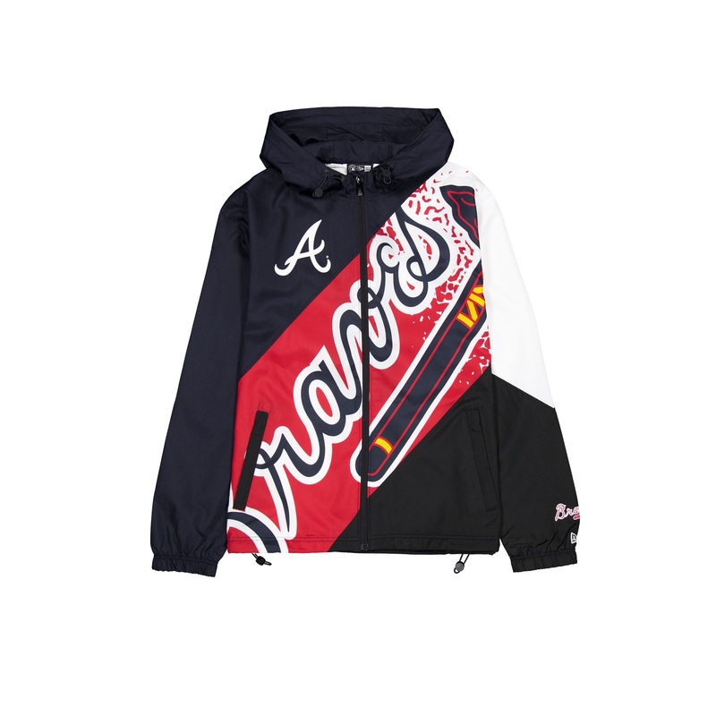The Atlanta Braves Sport Classics Color Block Windbreaker features a screen-printed Braves logo at the right chest and an alternate team logo at the left wrist. Additional details include a sublimation printed team graphic across the front and a full zip c