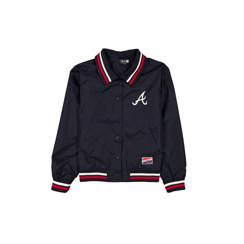 The Atlanta Braves Throwback Women’s Jacket features an embroidered Braves logo at the left chest with a screen-printed wordmark at the rear. Additional details include front pockets, a button closure, and a New Era jock tag at the left hip.
