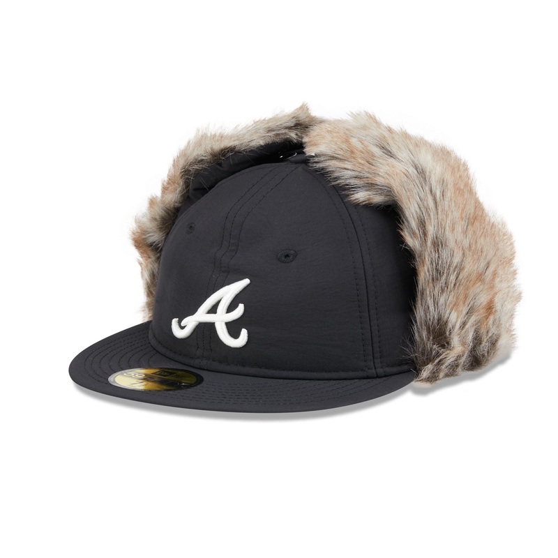 The Atlanta Braves Winter Dog Ear Retro Crown 59FIFTY Fitted Cap features an embroidered Braves logo at the front panels with a matching MLB Batterman logo at the rear. Additional details include faux fur ear covers at each side and a gray undervisor.