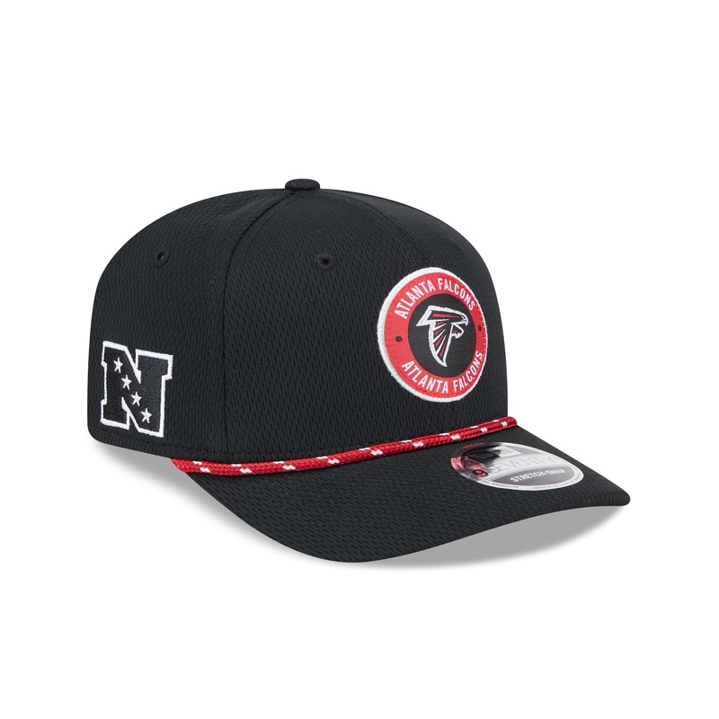 The Atlanta Falcons 2024 Sideline 9SEVENTY Stretch-Snap features an embroidered Falcons logo at the front panels with a Conference patch at the right-wear side. Additional details include a rope at the base of the crown and an NFL Shield above a snapback closure at the rear.