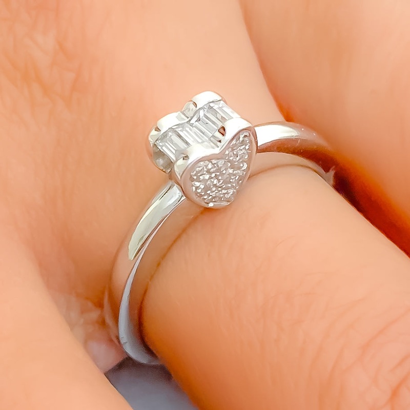 Designed to enchant, this 18k white gold ring weighs 3.1 grams and features a charming heart motif adorned with 0.36 carats of round and baguette-cut diamonds. Graded F-G in color and VS in clarity, the stones radiate refined brilliance from every angle. S