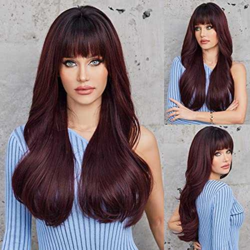 - A regal, wavy Auburn Ombre Wine Color Wig with Bangs is the perfect accompaniment to any ensemble. Boasting an exquisite hue, elegant sheen, and impeccably crafted style, its remarkable texture will make it an instant favorite. Meticulously constructed with premium heat-resistant synthetic fibers, this lavish wig is designed to look natural, soft, and affords an effortless comfort, light as a feather and with no pressure on the headat a traditionally size of 21.5-22.13 inches. A luxurious look for all.