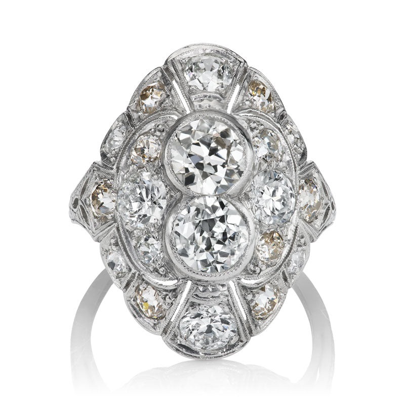 TheAzariaring is an authentic vintage diamond ring from the Art Deco Era circa 1920. The ringfeatures two old European cut diamonds, each weighing approximately 0.80-carats. An additional 18 old European cuts are set throughout the intricate setting, giving a layered appearance. The center stones are approximately J-K in color while the remaining stones range in color from J-N, light brown, all combining for roughly 2.00-carats. The stones are set in an intricate handmade platinum setting. The ring is currently size6.5+ and can be resized!