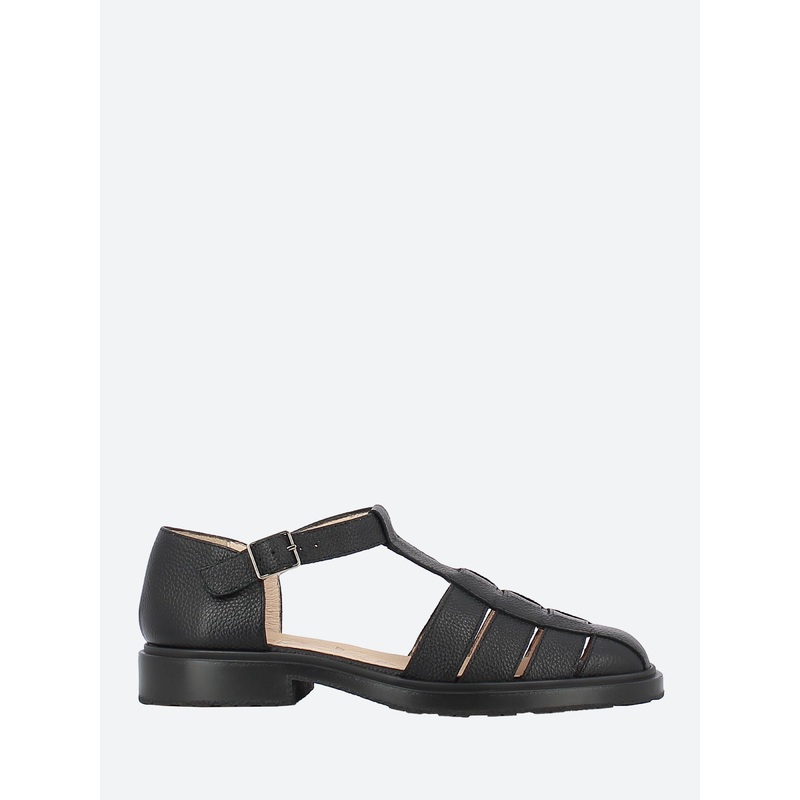 Closed toe fisherman sandal in pebbled leather on a low profile rubber sole.Adjustable T-strap with buckle closureSlip-on styleMemoryGel insoleFoam midsoleAlmond toeMaterialsUpper: leatherLining: leatherOutsole: rubberMade in SpainSize GuideFits true to si