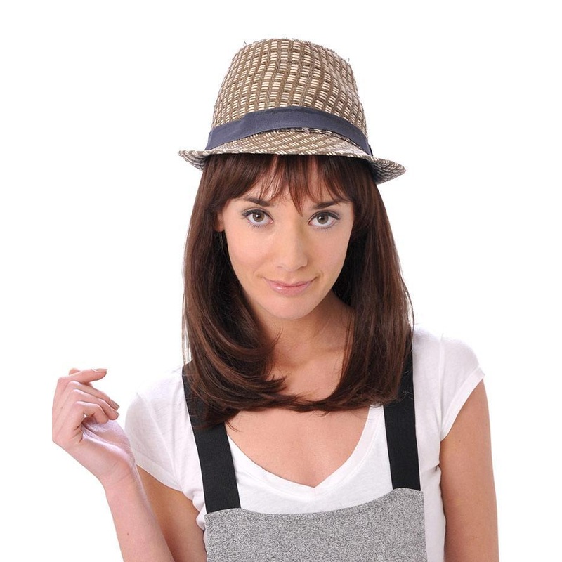 This piece is meant to be worn with a hat. Comes with an optional bang.