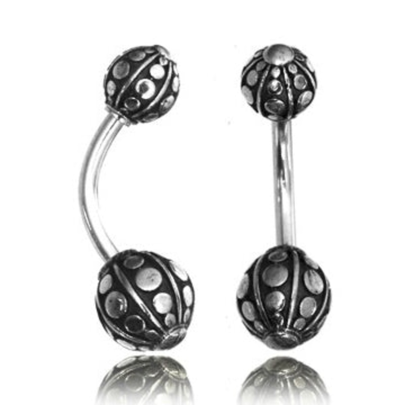 The 14 gauge bali dot belly ring ismade from white brass and 316L stainless steel with external threading. The 6mm top ball is removable and the 8mm bottom ball is fixed.