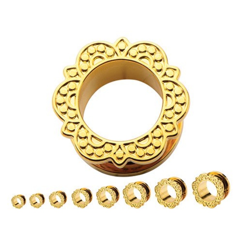 These screw-on bali tunnels are made from gold PVD coated 316L stainless steel with external threading.They have a wearable area of 5/16" between flares.The back side unscrewsfor easy insertion. Choose your size below.