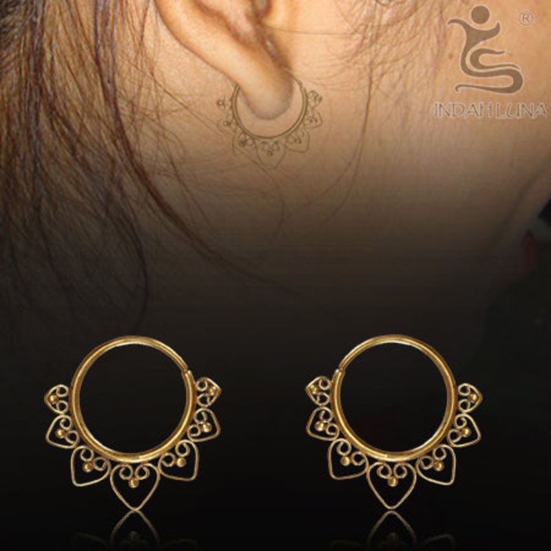 These 16 gauge bali heart hoops are made of solid yellow brass and measure approximately 42mm tall x 46mm wide.